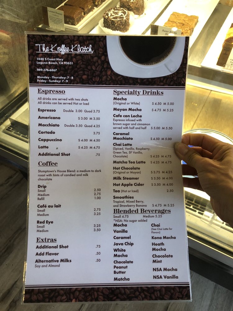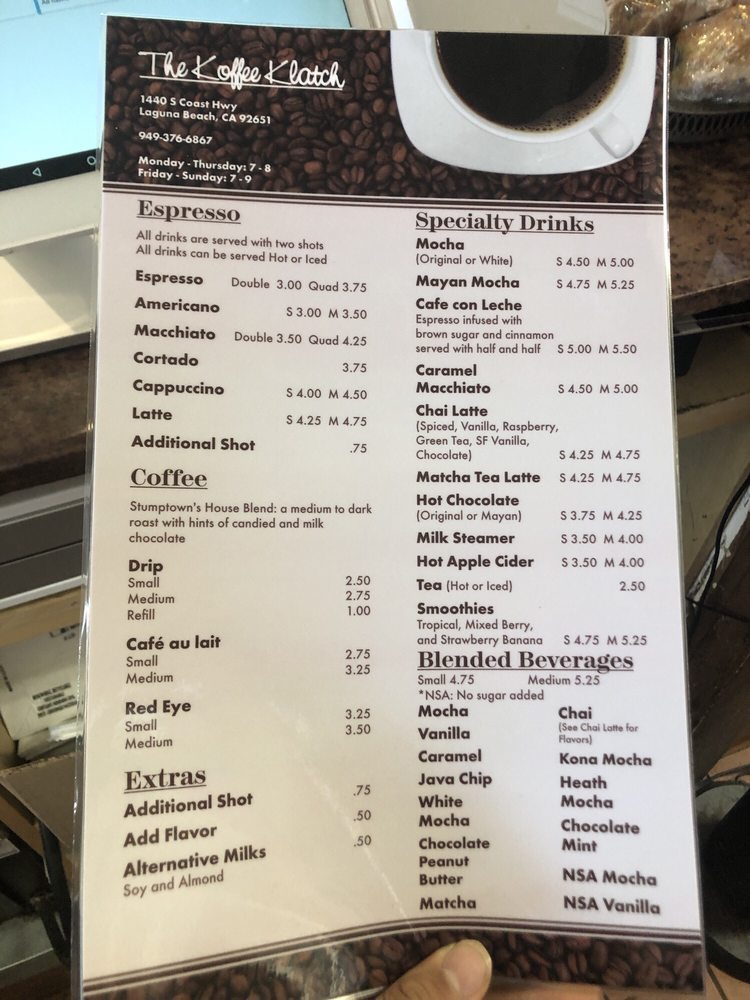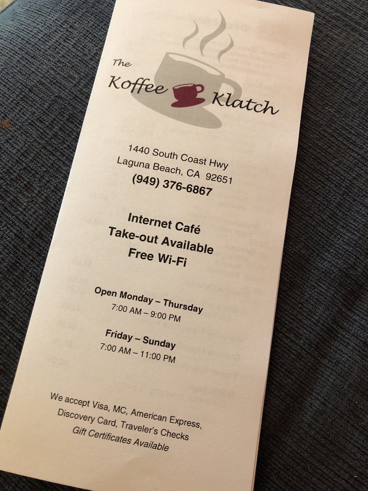 Koffee Klatch is a charming cafe located in Laguna Beach, CA, offering a mix of juice bar, coffee, and tea options. This cozy spot features vegan choices, wheelchair access, and even welcomes furry companions. Customers praise the friendly baristas and the wide array of beverages, from matcha lattes to caramel macchiatos. The cafe's retro 90s decor and laid-back ambiance make it a favorite among locals and visitors alike. Whether you're looking for a relaxing spot to work or unwind, Koffee Klatch with its outdoor seating and free Wi-Fi has got you covered. Don't miss out on their delicious desserts, like the mini berry cheesecake that left one customer craving for more. Experience a slice of heaven at Koffee Klatch, where every cup is brewed with care and every visit feels like a mini vacation.